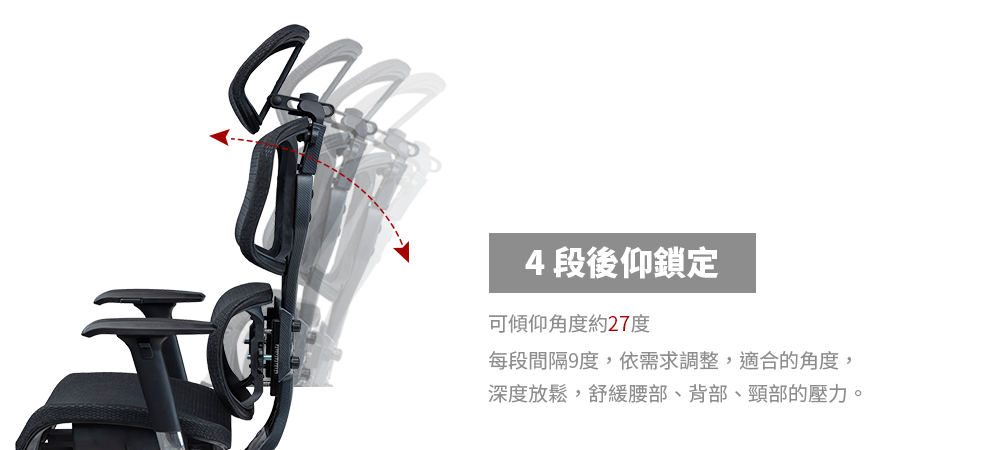 🔸四段後躺固定,新款加大頭枕,可調上下/前後/旋轉支撐