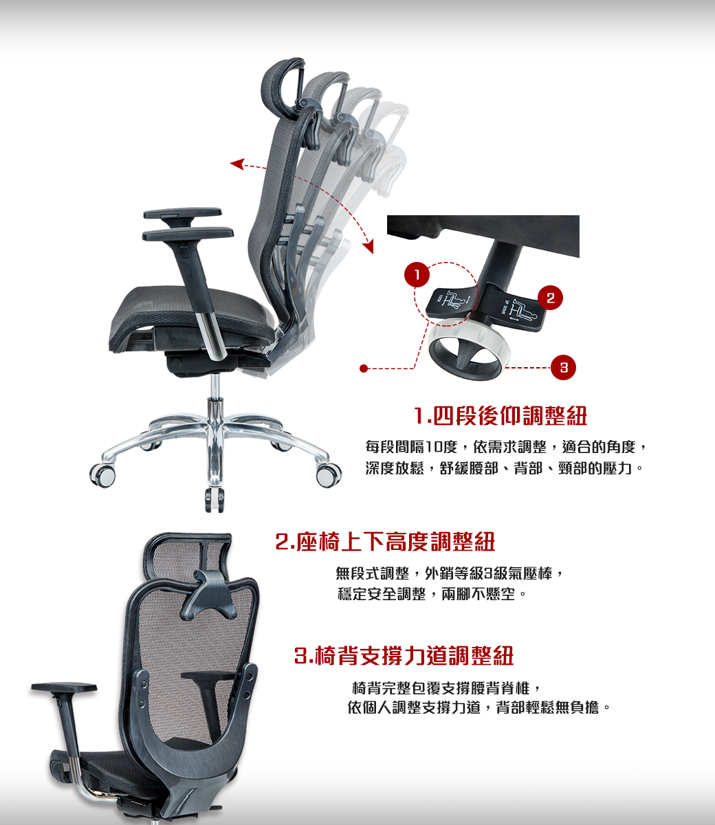 🔸高背完整包覆腰背,四段後躺固定,多角度旋轉頭枕
