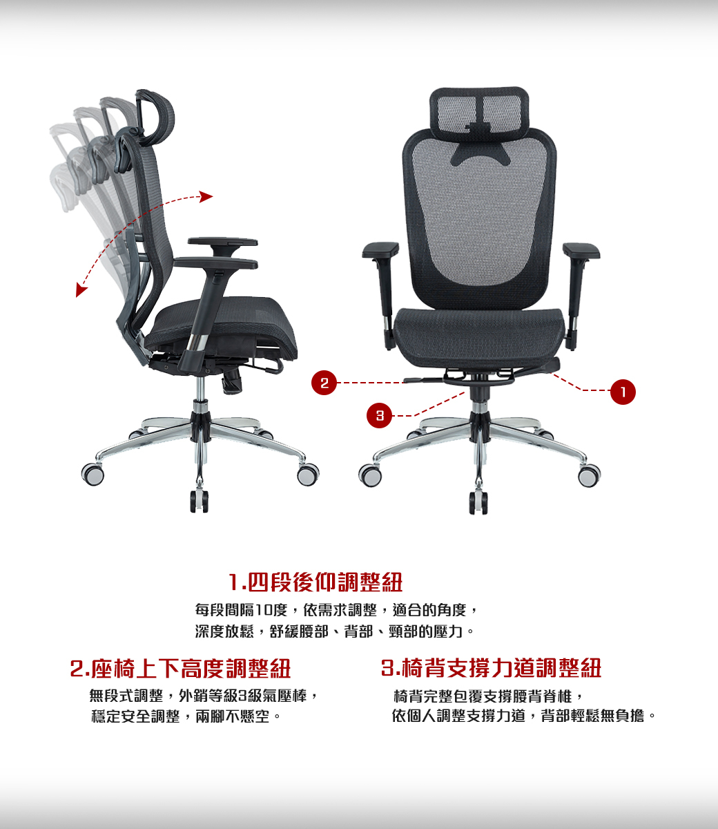 🔸高背完整包覆腰背,四段後躺固定,多角度旋轉頭枕