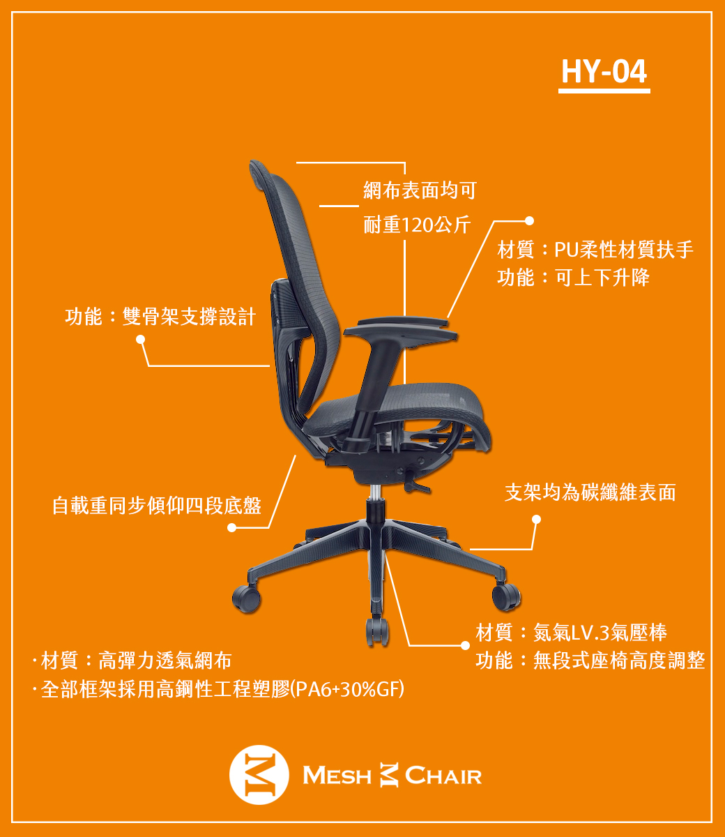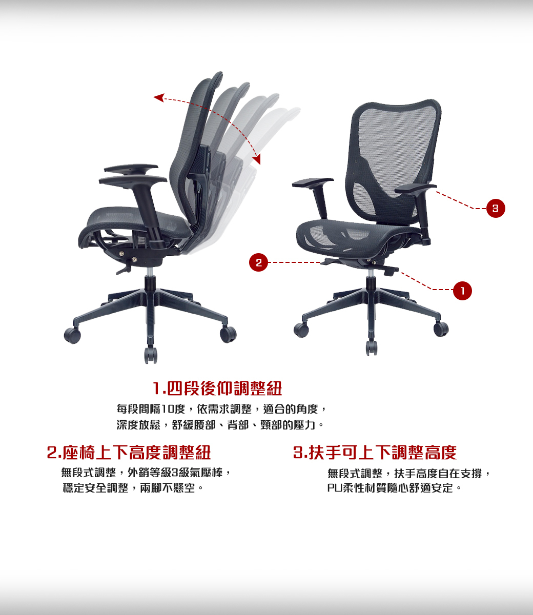 🔸高背完整包覆腰背,自載重四段後躺固定底盤